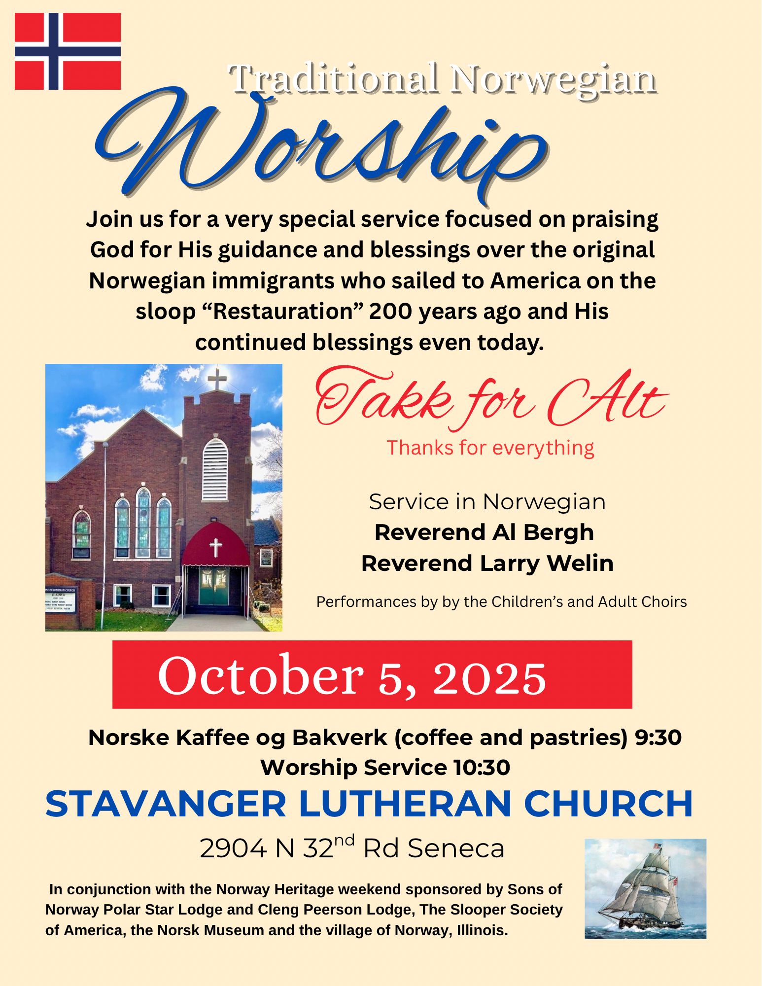 Join us for a very special service focused on praising God for His guidance and blessings over the original Norwegian immigrants who sailed to America on the sloop “Restauration” 200 years ago and His continued blessings even today.